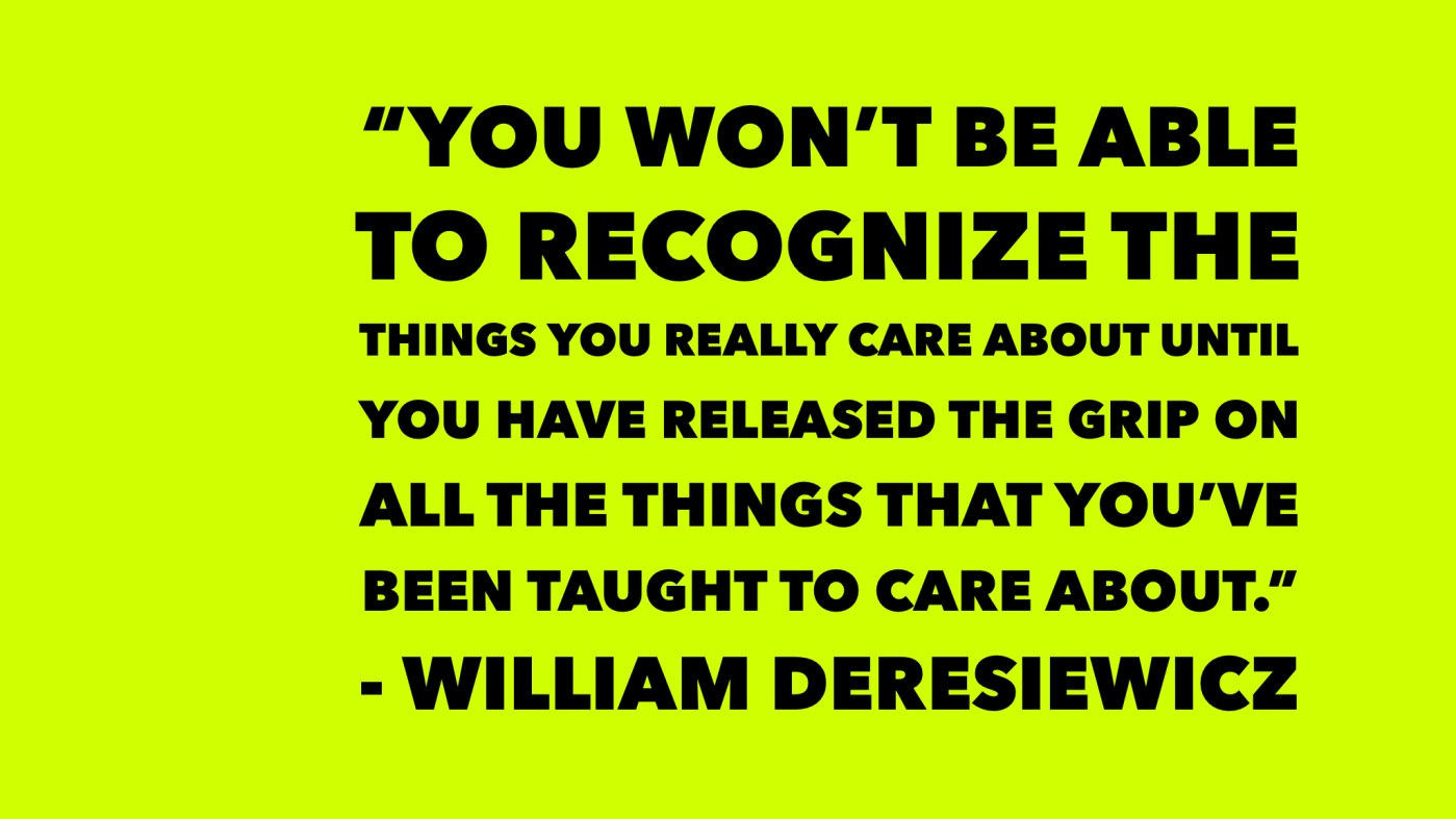 “You won’t be able to recognize the things you really care about until you have released your grip on all the things that you’ve been taught to care about.” – William Deresiewicz