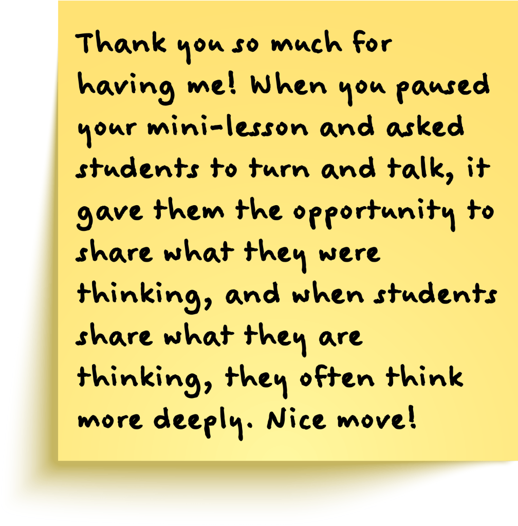 30 Second Feedback works not simply because it’s positive, but because it’s very specific about the teaching move and the impact that move had on learning. It’s a fairly simple formula: teaching move (cause) and then learning (effect.) Mike encourages us to include a nice cushion at the beginning to ensure we are disarming with the understanding that regardless of how kind and warm we are, our presence as administrators can be a bit unnerving to teachers. And then a nice tag at the end. I’ve included an example from Legacy of Learning below.
