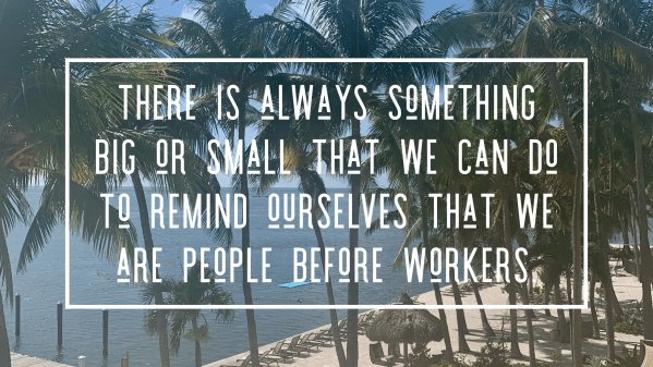 Rather, if we take the time we need, we will be better rested and more emotionally available for others. This looks different for everyone. There is no one right way to recharge. But knowing ourselves and giving ourselves what we need is the first step to taking care of others as well.
