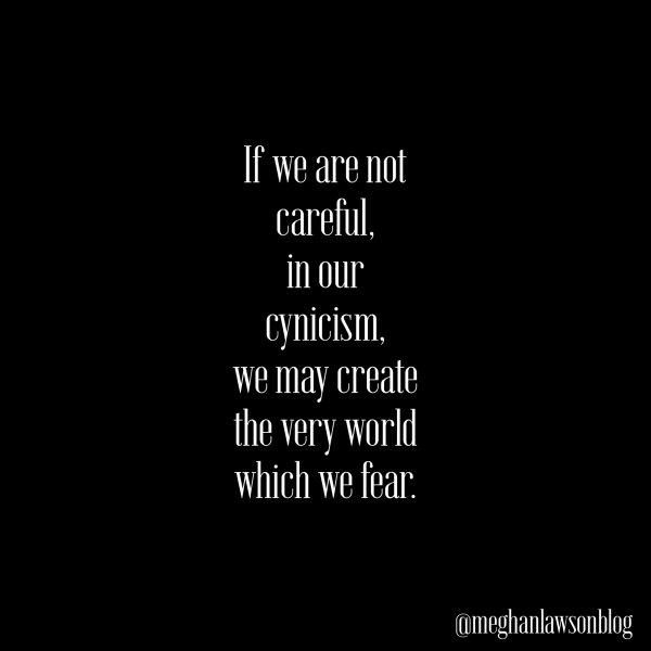 Often, we become what we think about. We become what we do. “We become our conversations” as my friend, Kelly Croy says So, if we are not careful, in our cynicism, we may create the very world which we fear. We may create the very worst possible reality for ourselves and others.