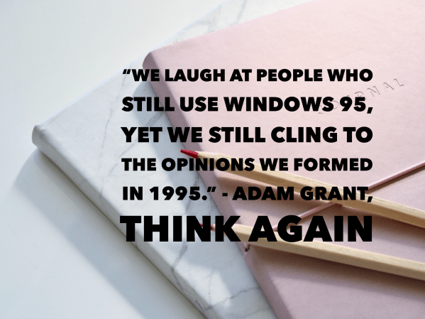 My hope for all of us is that we are brave enough to ask big questions of ourselves and the world. As Adam Grant says, "We laugh at people who still use Windows 95, yet we still cling to the opinions we formed in 1995." Writing is a great strategy for growing our thinking and humanity.